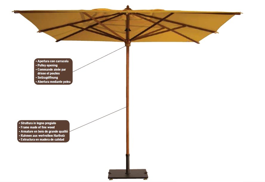 LIPARI Umbrella FIM laminated hardwood frame, with double pulley opening system. Pole Ø 5 or 5,5 cm. Lipari is available with or without ruffles and windproof. Cover: rectangular 200x300 cm, and 300 x 400 cm., square 300x300 cm. Minimum weight on the base: kg. 75 (sold separately). FIM aluminum structures have special nylon and stainless steel details, which guarantees sturdiness, durability and weather resistance. Design is always sober, refined and elegant.