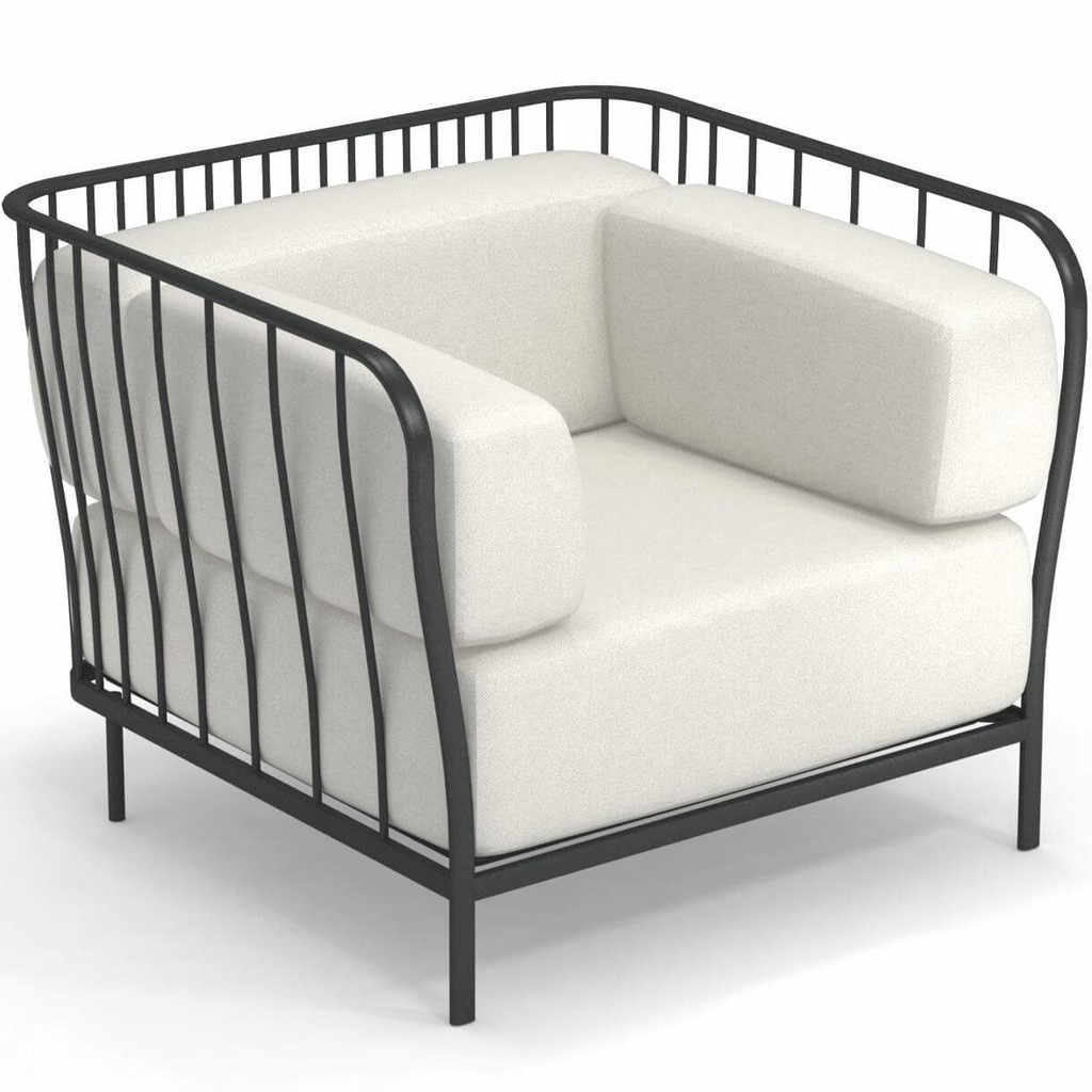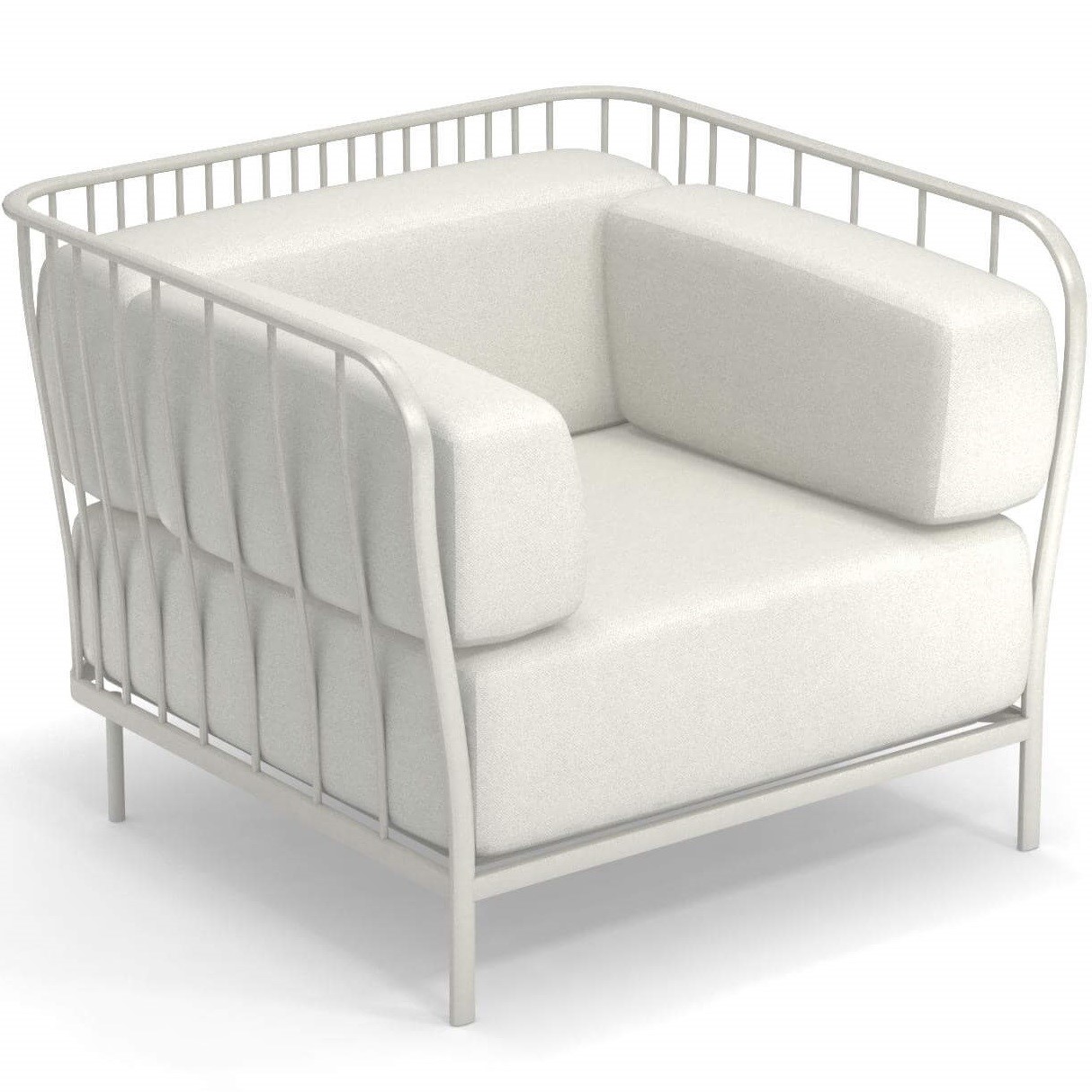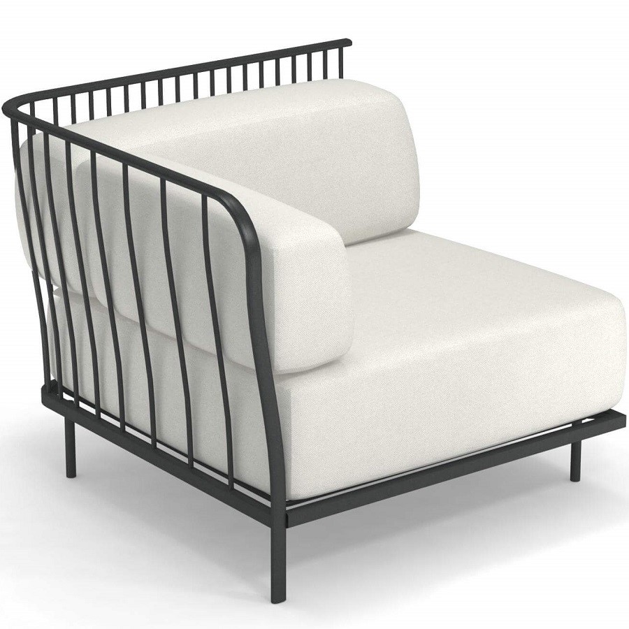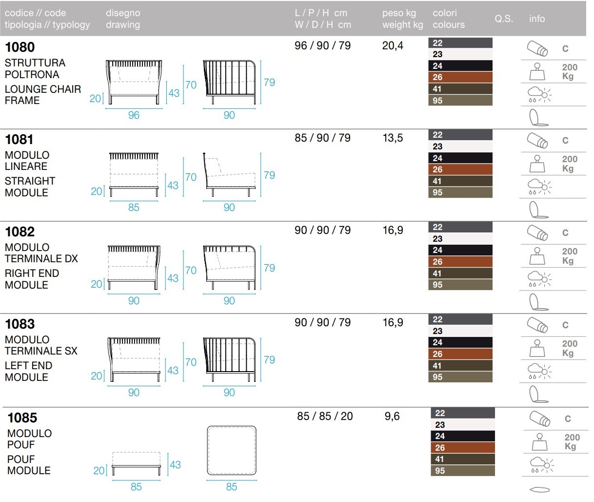 Cannolè seating system has a fully welded structure composed of internally and externally galvanized steel tubes. Seat made up of a galvanized rod grid welded onto a rod frame. The legs are made of tubular steel. MIG welding, degreasing and cataphoresis pre-treatment and polyester thermosetting powder finishing. The collection consists of: Corner module sofa, linear module sofa, pouf, low armchair and low table. All Cannolè cushions are made of polyurethane rubber to which a layer of polyester fiber resin is added, all packaged in a water-repellent polyamide inner pillowcase.
