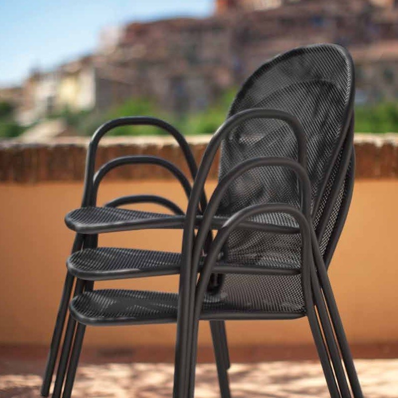 Ronda has long been a landmark world-wide, with easy design, classic, sober and elegant lines. It has great resistance to daily use and also to the elements. Is a practical garden collection, lightweight and stackable composed of chair, armchair and bar stool. Made of perforated expanded metal.